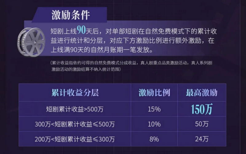 在激励核算与发放方面,平台将在短剧上线满90天后,对其在免费模式下的累计收益进行统计,并依据不同收益区间核算额外激励,在上线满90天后的自然月一次性发放。具体而言,累计收益超过500万元的作品,按15%给予额外激励,最高150万元;累计收益在300万元至500万元之间的,按10%给予额外激励,最高50万元;累计收益在200万元至300万元之间的,按8%给予额外激励,最高24万元。